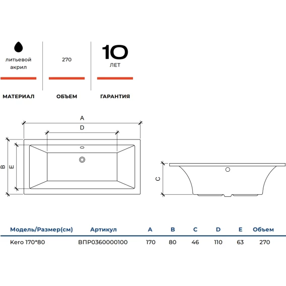Акриловая ванна Alba Spa Kero ВПР0360000100 170x80 см, белый