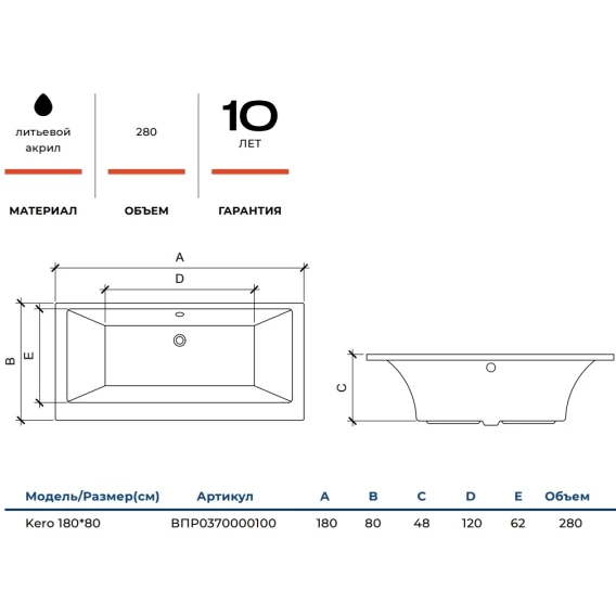 Акриловая ванна Alba Spa Kero ВПР0370000100 180x80 см, белый