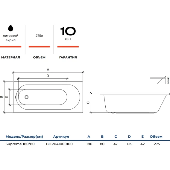 Акриловая ванна Alba Spa Supreme Slim ВПРСБ041000100 180x80 см, врезная, белый