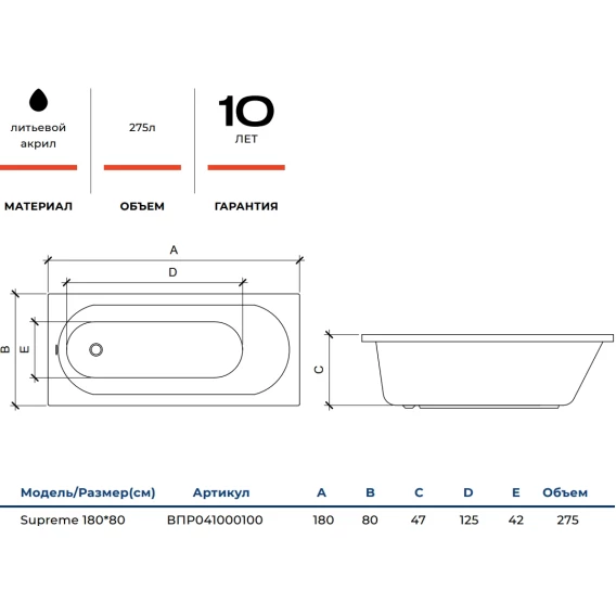 Акриловая ванна Alba Spa Supreme ВПР041000100 180x80 см, белый