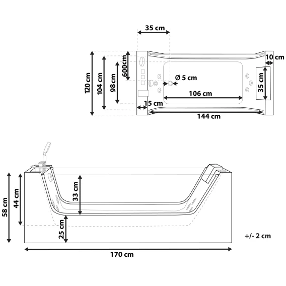 - Датчик сухого пуска защищает гидромассажную систему от поломки в случае включения ванны без воды