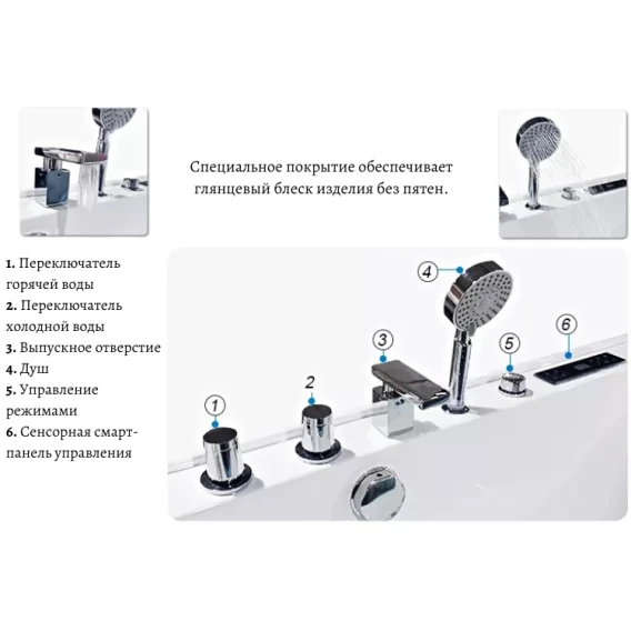 - Датчик сухого пуска защищает гидромассажную систему от поломки в случае включения в ванне без воды