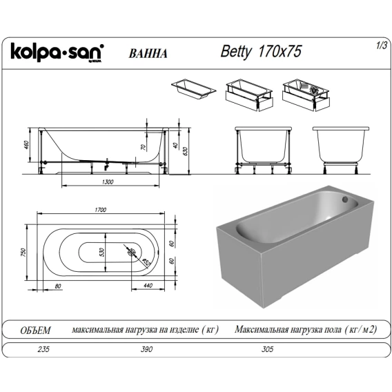 Акриловая ванна Kolpa-San Betty 565960 170x75 см, белый
