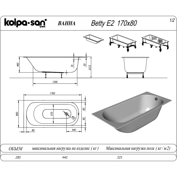 Акриловая ванна Kolpa-San Betty E2 567800 170x80 см, белый