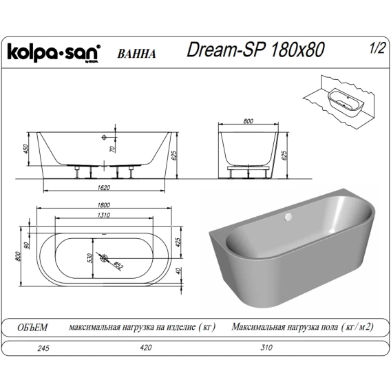 Акриловая ванна Kolpa-San Dream SP 570390 180x80 см, белый
