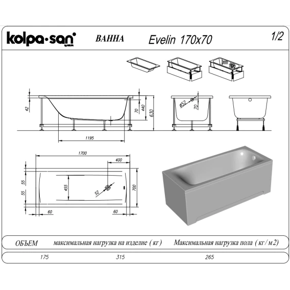 Акриловая ванна Kolpa-San Evelin 590250 170x70 см, белый