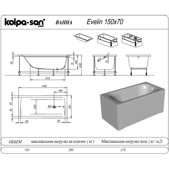 Акриловая ванна Kolpa-San Evelin 590270 150x70 см, белый