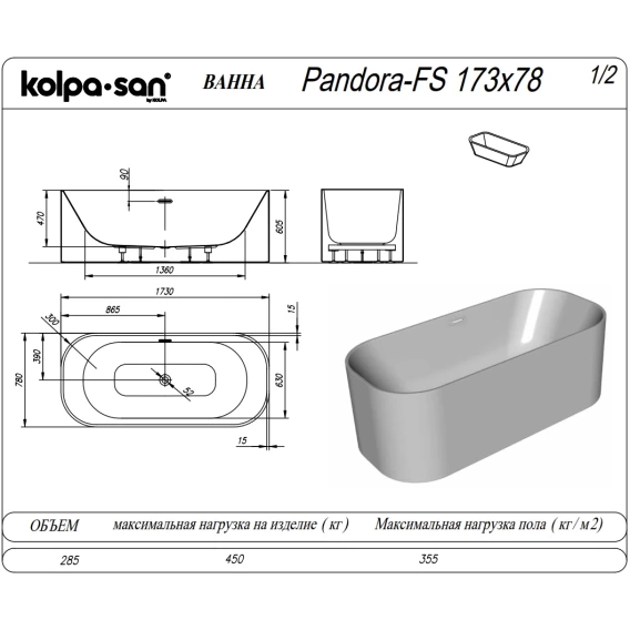 Акриловая ванна Kolpa-San Pandora FS 593150 173x78 см, отдельностоящая, белый