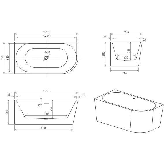 Акриловая ванна Royal Bath Riva RB610310L-GD 150x75 см L, угловая, белый