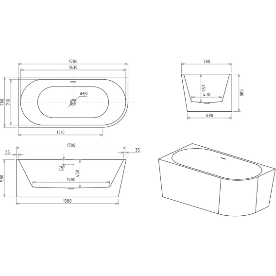 Акриловая ванна Royal Bath Wave RB610100BL 150x73 см, отдельностоящая, белый