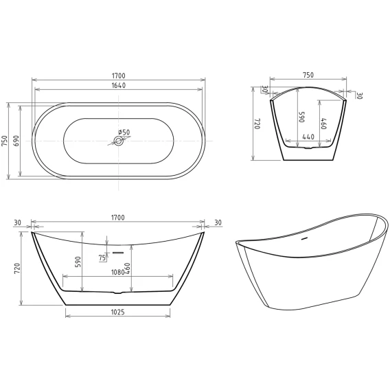 Акриловая ванна Royal Bath Wave RB610101BL 170x75 см, отдельностоящая, белый