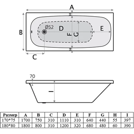 Акриловая ванна Vincea VBT-2S170-LG 170x75 см, белый