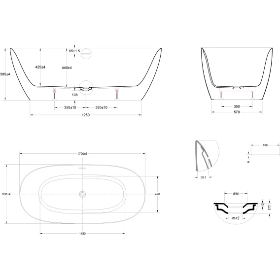 Акриловая ванна Vincea VBT-701-1700MW 170x80 см, отдельностоящая, белый матовый
