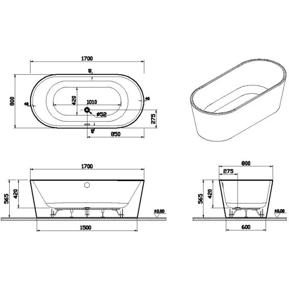 Акриловая ванна VitrA Geo 65370006000 170x80 см, отдельностоящая, белый