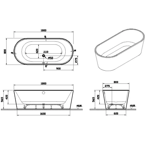 Акриловая ванна VitrA Geo 65380006000 180x80 см, отдельностоящая, белый
