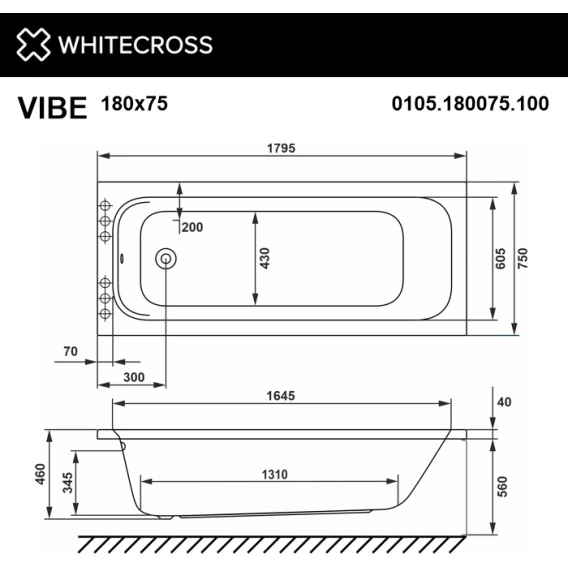 Акриловая ванна Whitecross Vibe 0105.180075.100.NANO.CR 179,5x75 см, с гидромассажем, белый