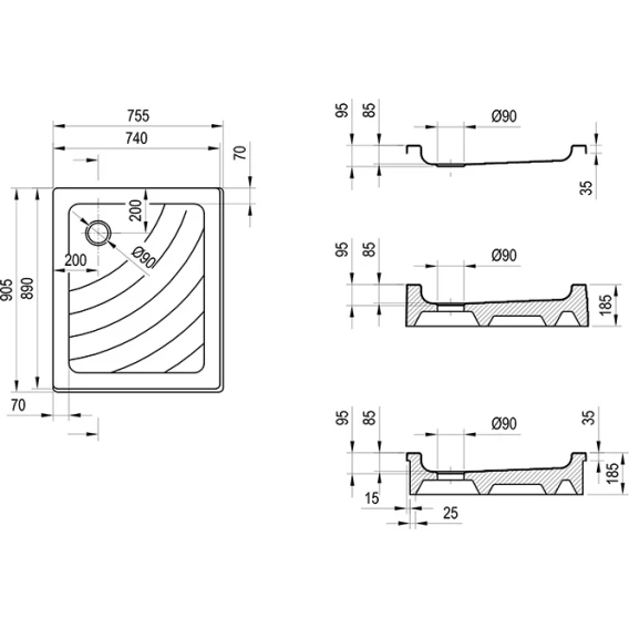 Поддон Aneta подходит для ванных комнат 75 x 90 см с душевыми уголками ASRV3-75 + ASRV3-90, SRV2-S 75 + SRV2-S 90 или душевыми дверьми ASDP3-90, SDZ3-90, SDOP-90, BLRV2, PDOP1-90, SMSD2-90, BSD2-90.