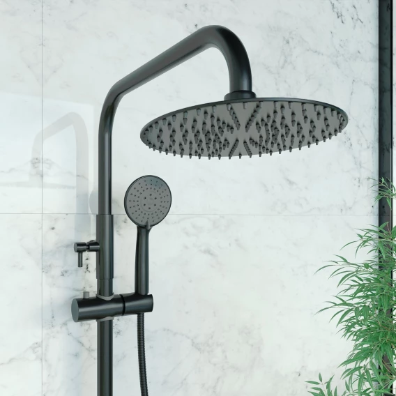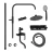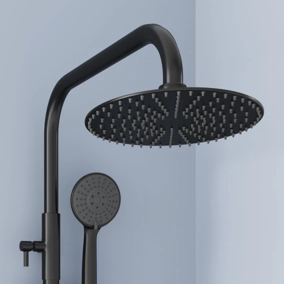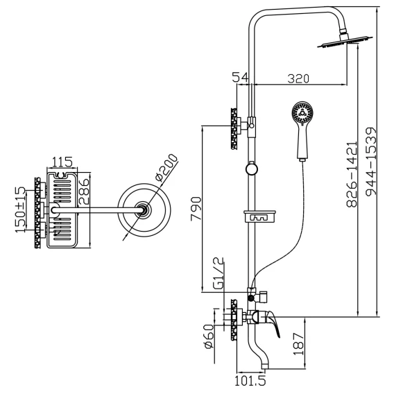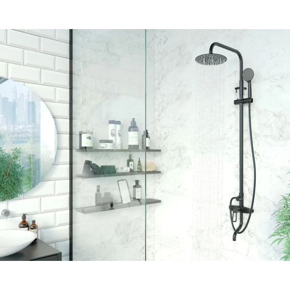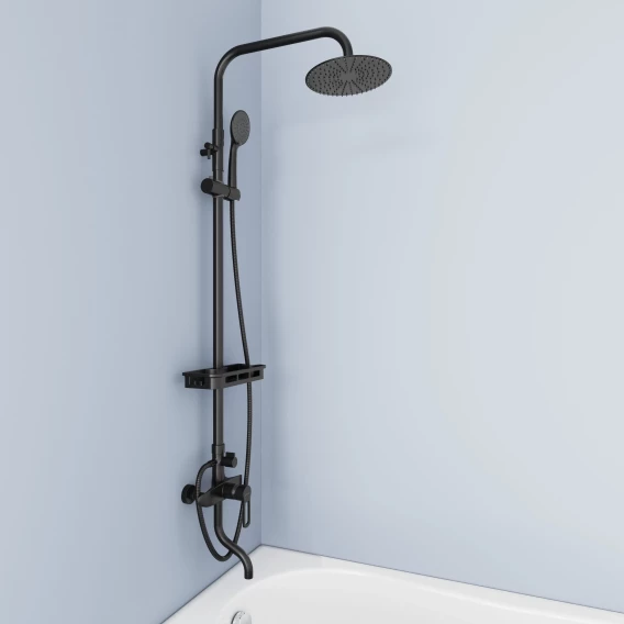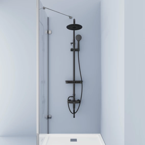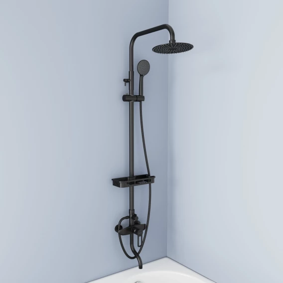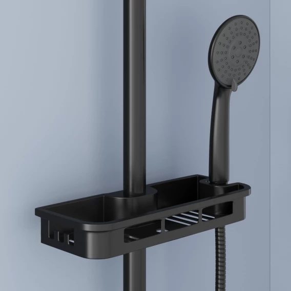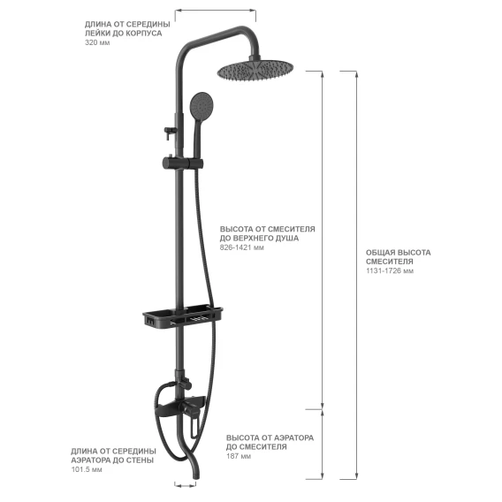 Аэратор, Металлическая розетка, Эксцентрики, Душевой шланг, Душевая лейка, Держатель для душевой лейки, Полочка, Верхний душ, Смеситель, Кронштейн, Штанга душевая