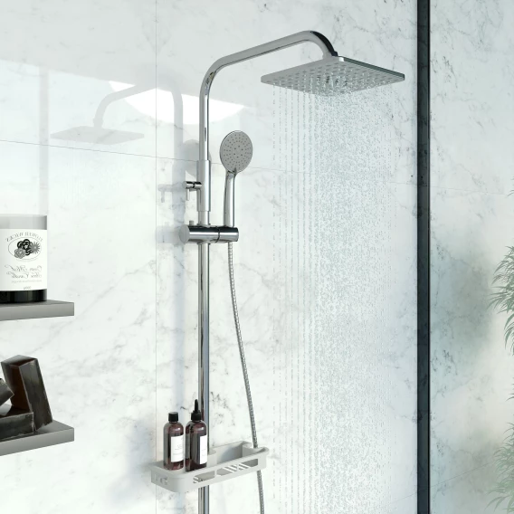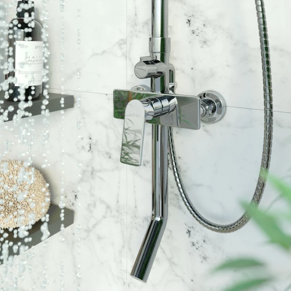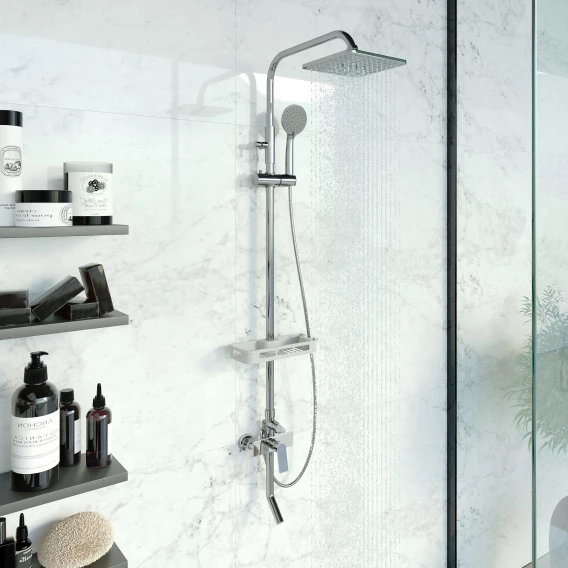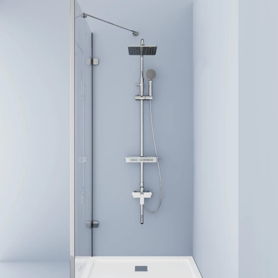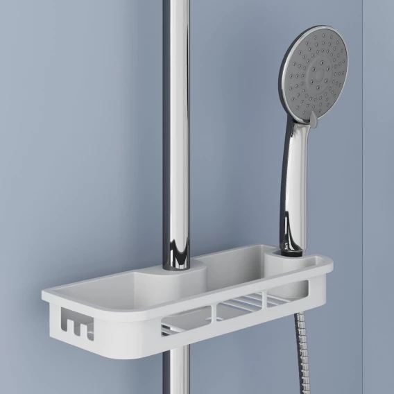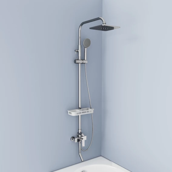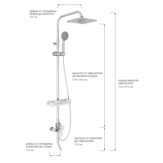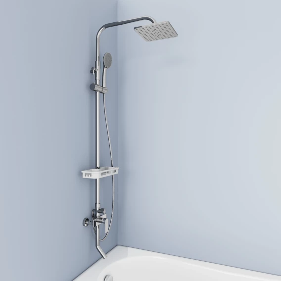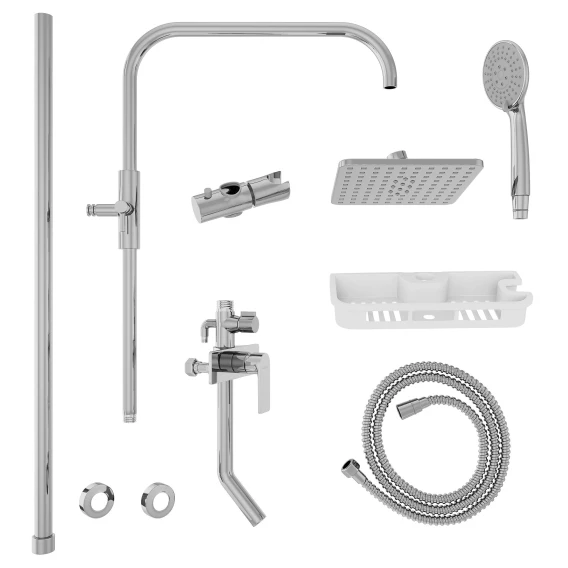 Аэратор, Металлическая розетка, Эксцентрики, Душевой шланг, Душевая лейка, Держатель для душевой лейки, Полочка, Верхний душ, Смеситель, Кронштейн, Штанга душевая