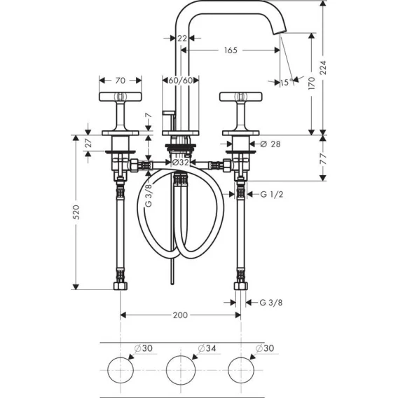 • состоит из: смесителя для раковины на 3 отверстия, сливного набора