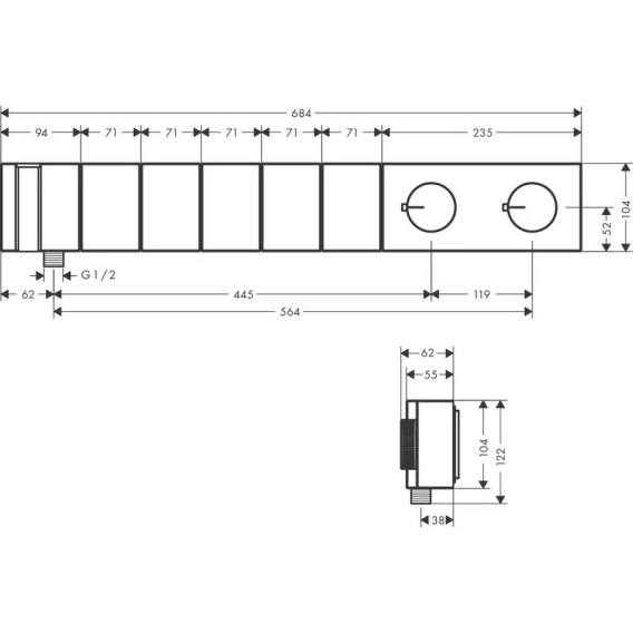 • термостат поставляется с кнопками Rain large, ручным душем, Mono, PowderRain small и PowderRain large.