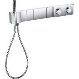 • состоит из: термостатического модуля, держателя для душа, ручного душа с дубинкой, душевого шланга.