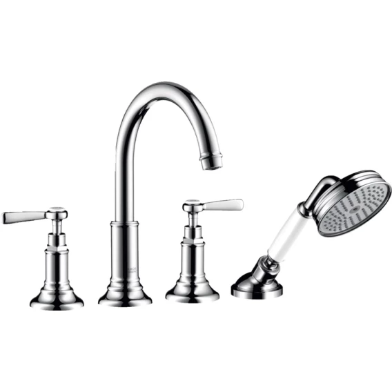 • состоит из: смесителя для ванны на плитке на 4 отверстия, ручного душа, душевого шланга, держателя для душа