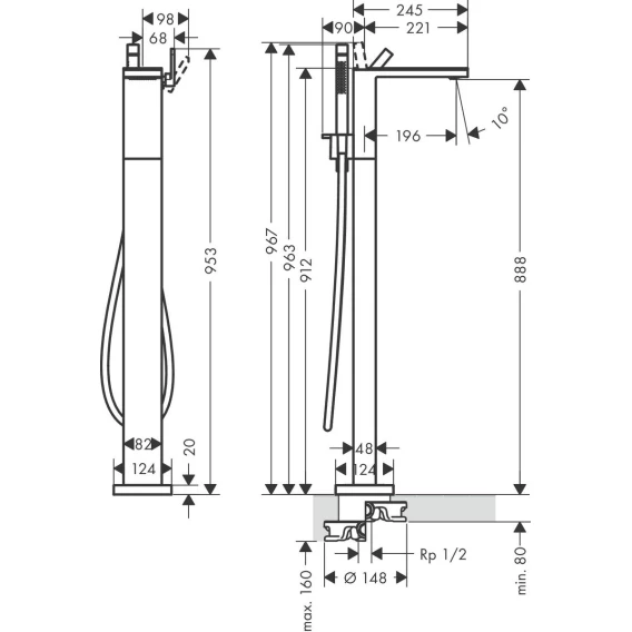 • состоит из: однорычажный смеситель для ванны напольный, тарелка, ручной душ с дубинкой, душевой шланг, держатель для душа
