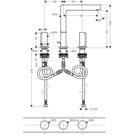 • состоит из: смесителя для раковины на 3 отверстия, сливного набора