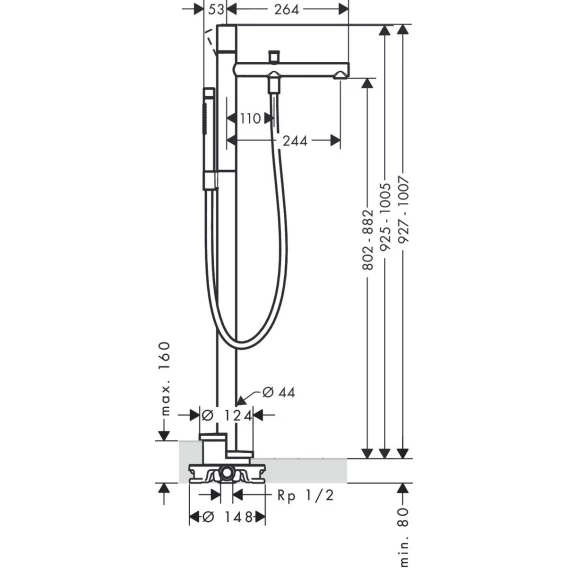 • состоит из: однорычажный смеситель для ванны напольный, ручной душ, душевой шланг, держатель для душа