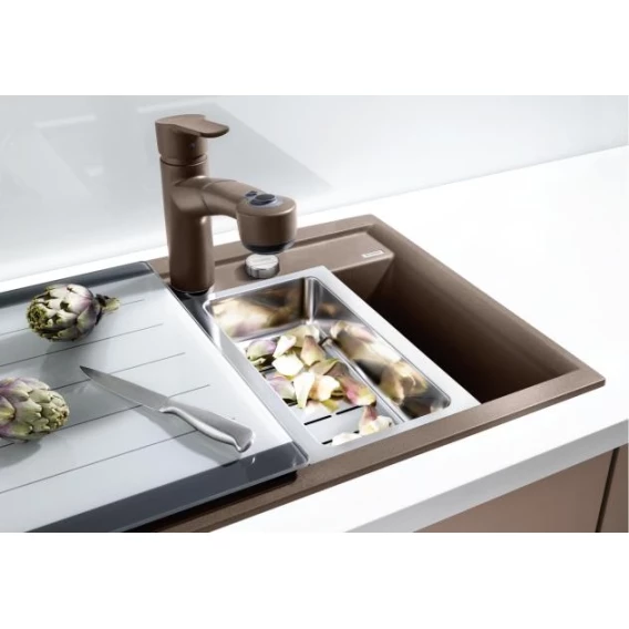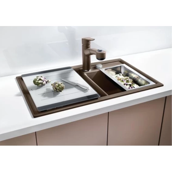 • Дополнительные аксессуары: элегантная разделочная доска из закаленного стекла закрывает чашу и служит дополнительной рабочей поверхностью, многофункциональный коландер для дополнительной чаши