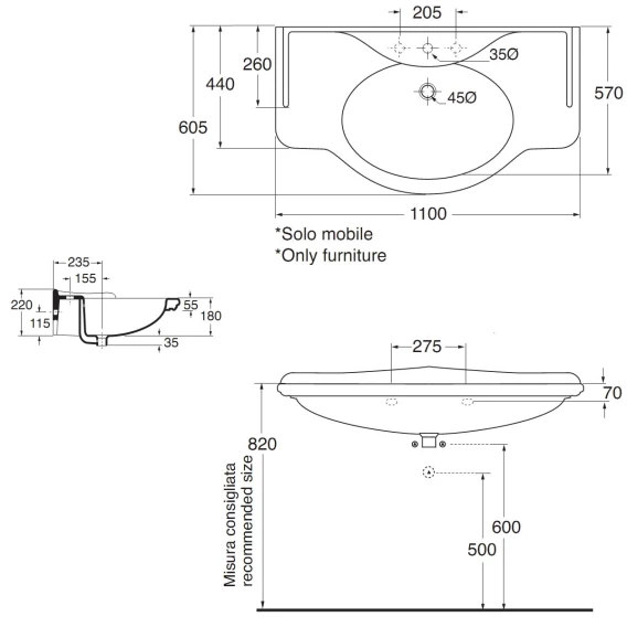 Раковина консоль 110x65 см с тремя отверстиями под смеситель Azzurra Giunone GIU200110/ALZAT bi*3