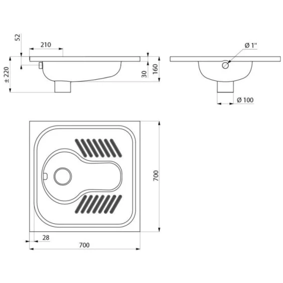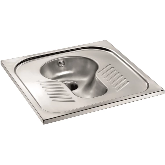 • Встраиваемый в пол унитаз для сидения на корточках изготовлен из цельного куска бактериостатической нержавеющей стали AISI 304 толщиной 1,2 мм с сатинировкой.