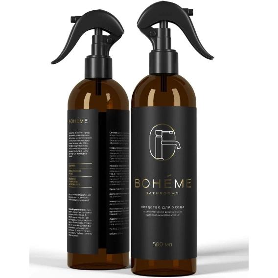 Средство «Бохеме» предназначено для ежедневного ухода за сантехникой со специальными покрытиями, такими как хром, pvd бронза, pvd золото, pvd gunmetal, брашированные покрытия, матовый черный и матовый белый.