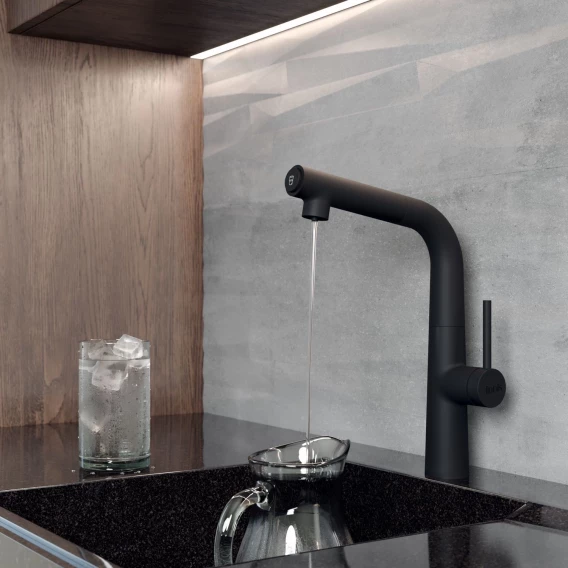 Cмеситель для кухни Pure актуального матового черного цвета с отдельным каналом для подачи фильтрованной воды не требует дополнительного отверстия в мойке под фильтр. К смесителю можно подключить фильтр любого производителя и наслаждаться чистой водой прямо из смесителя – она удобно включается простым нажатием кнопки на изливе.• Надежный корпус из прочной первичной латуни с пониженным содержанием свинца — стойкий к коррозии, резким изменениям давления и перепадам температуры воды.• Керамический картридж Softap обеспечивает точную регулировку температуры и напора воды за счет особенно плавного хода ручки смесителя.• Картридж выдерживает максимальную температуру до 95оС и гидроудар до 35 атмосфер, прошел тестирование на жизненный цикл по европейскому стандарту EN817. • Гарантия на смесители IDDIS® — 10 лет.