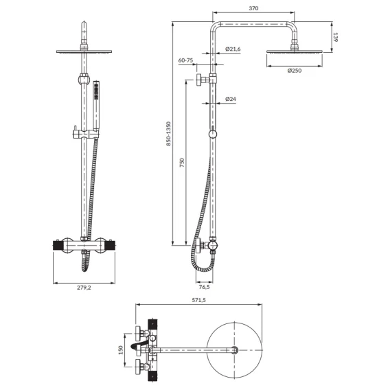 • верхний душ латунный, размер: ø25 см, отдаленность от стены: 44,6 см