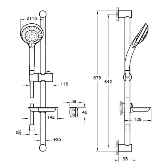 Душевой шланг, Душевая лейка, Держатель для душевой лейки, Мыльница, Штанга душевая