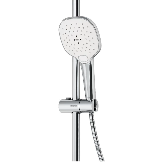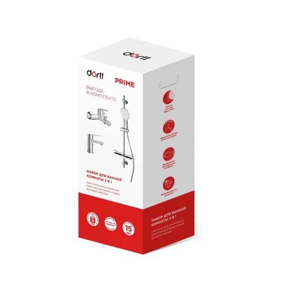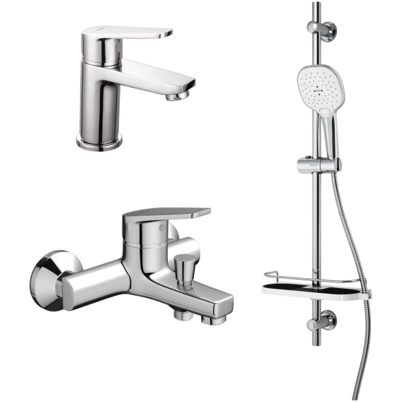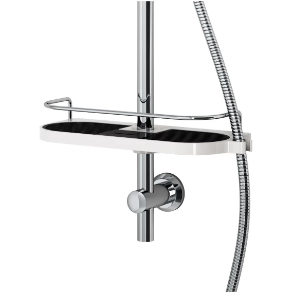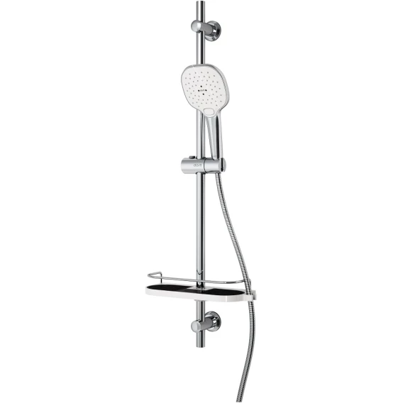 Аэратор, Гибкая подводка, Металлическая розетка, Эксцентрики, Душевой шланг, Душевая лейка, Держатель для душевой лейки, Полочка, Смеситель, Штанга душевая