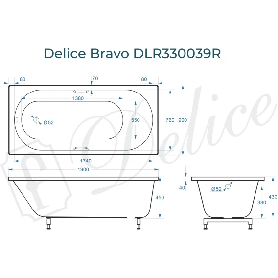 Для установки используются фирменные ножки Delice, которые имеют надежное и прочное крепление, обеспечивают высокую устойчивость ванны и регулируются по высоте. Высота на ножках варьируется от 59.5 до 63 см. С помощью регулировки можно нивелировать геометрические отклонения пола, стен и углов в ванной комнате. За счет высокой плотности материала, при установке не требуется шумоизоляция, а также заземление, так как литьевой мрамор не проводит электрический ток. При необходимости изменения габаритов под ванную комнату, борты ванны можно уменьшить механической обработкой.