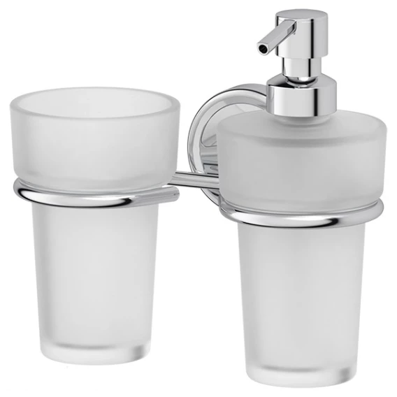 Форма стеклянной емкости повторяет форму стакана, что придает коллекции гармоничность и подчеркивает ее индивидуальность. Стекло емкости и его матировка полностью идентичны стеклу других предметов коллекций. Полупрозрачное стекло позволяет наблюдать расход жидкого мыла. Компоненты помпы изготовлены из высококачественного пластика, а поверхность покрыта стойким хромом.