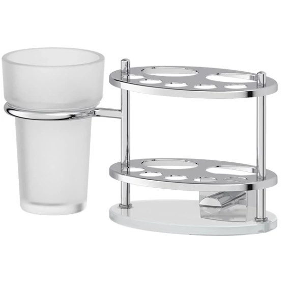 Комбинированная позиция держателя зубных щеток и пасты со стаканом, в котором можно хранить дополнительные предметы гигиены, такие как бритвенный станок и др., экономит пространство, средства и позволяет избежать лишнего сверления стен.