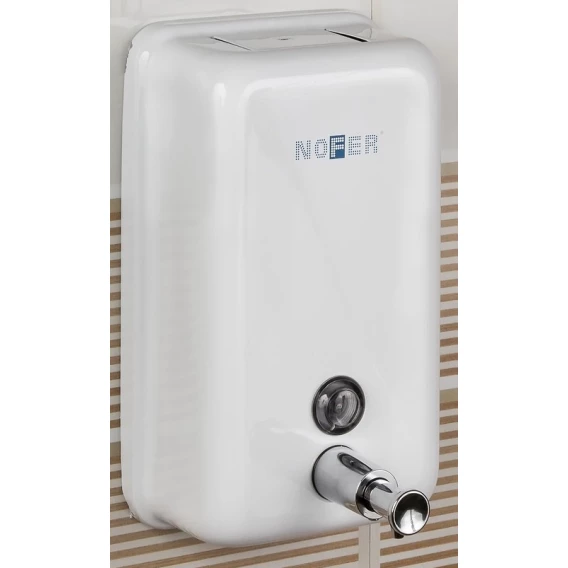 Дозатор для моющего средства NOFER 03001.W из стали окрашенной, объёмом 1200 мл, толщиной 1,0 мм. Дозатор для мыла настенный поставляется в комплекте с монтажным комплектом и универсальным ключом. Диспенсер наливной предназначен для любого мыла, любого состава, любой марки. Диспенсер не имеет острых углов, а корпус изготовлен из стали толщиной 1,0 мм, благодаря этому данный дозатор считается антивандальным. Главным отличием этой модели от большинства аналогов, предлагаемых конкурентами, является наличие металлической нажимной кнопки. Она изготовлена из хромированной латуни, а у большинства аналогов из пластика. Это решение инженеров из Испании позволяет продлить срок службы устройства в 3 раза!