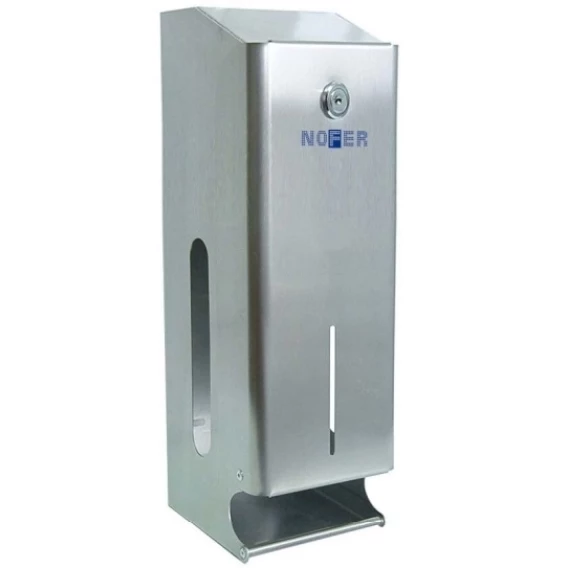 Антивандальный диспенсер для туалетной бумаги прямоугольный для 3 рулонов с фронтальной загрузкой бумаги выполнен из нержавеющей стали и оборудован антивандальным замком и окошком для контроля уровня бумаги. Подобное оборудование прекрасно подойдет для мест с высокой и средней посещаемостью, которые хотят подчеркнуть заботу о своих посетителях, поскольку использование стандартных рулонов на 60 метров намного более гигиеничный и комфортный процесс, чем большие индустриальные рулоны на 250-500 метров. Испанский производитель Nofer S.L.