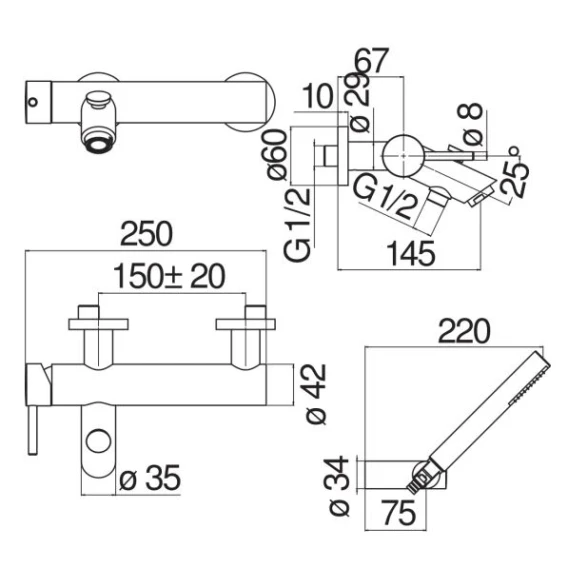 Аэратор, Металлическая розетка, Эксцентрики, Душевой шланг, Душевая лейка, Держатель для душевой лейки