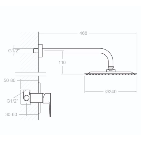 Верхний душ, Скрытая монтажная часть, Смеситель, Кронштейн