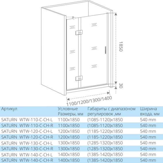 Душевая дверь 110 см Good Door Saturn WTW-110-C-CH-L прозрачное