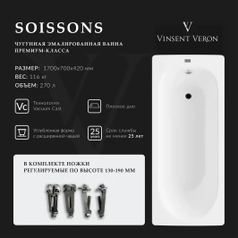 Ванна чугунная Vinsent Veron Soissons VCN1707042 170x70 см, белый