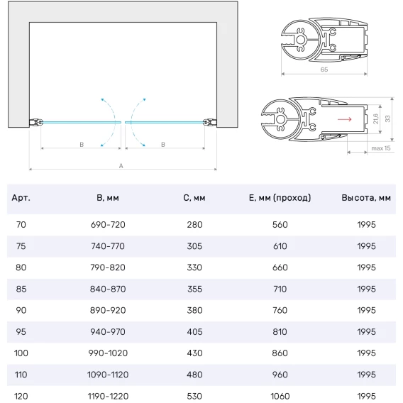Душевая дверь Vegas Glass E2P LUX 95 08 01 95 см, профиль хром, стекло прозрачное