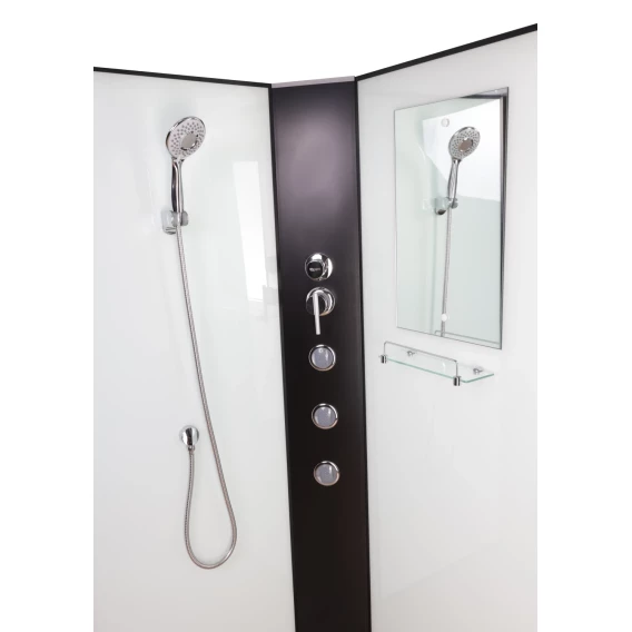 Душевой шланг, Душевая лейка, Подключение для душевого шланга, Полочка, Поддон, Смеситель, Сифон, Ножки, Зеркало