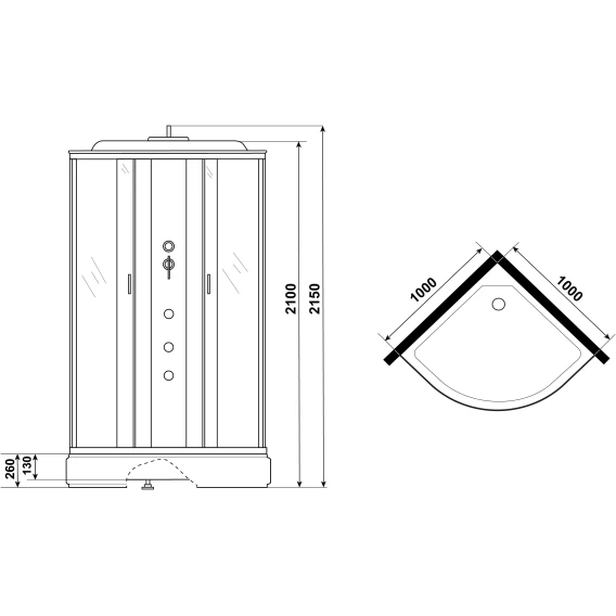 Душевой шланг, Душевая лейка, Держатель для душевой лейки, Подключение для душевого шланга, Полочка, Ручки, Верхний душ, Поддон, Сифон, Ножки, Зеркало